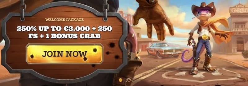 El bono de bienvenida ofrece 250% hasta 3.000€ + 350 tiradas gratis + 1 Bonus Crab en cuatro depósitos. Depósito mínimo de 20€, requisitos de apuesta de 35x (bono) y 40x (tiradas gratis), validez de 10 días. Las tiradas gratis se acreditan por 20 diariamente.